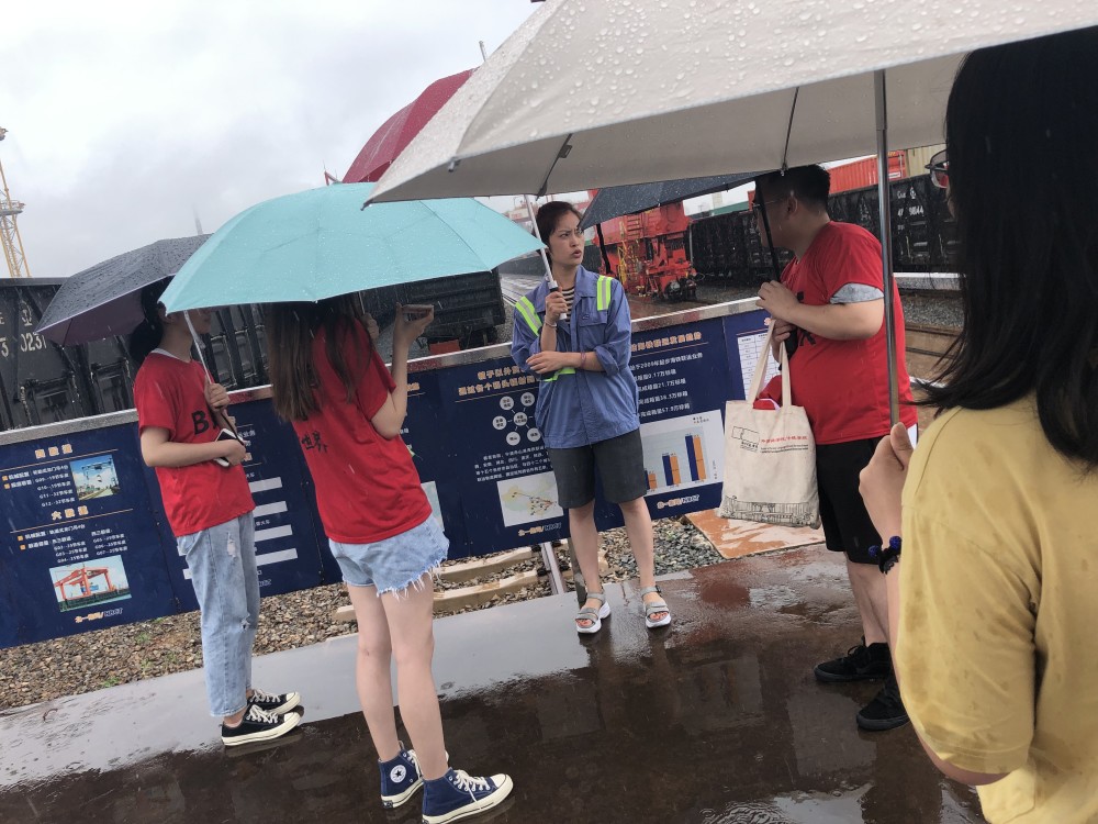 结束了在中国港口博物馆的调研活动,实践队成员来到了宁波北仑港国际集装箱码头有限公司。在港口接待人员的带领下,实践队参观了北仑港港口码头、海铁联运专列以及“一带一路国际物流联盟”中的海铁联运部分,“义甬舟”大通道开放将义乌铁路口岸的陆运与宁波舟山港的海运连接起来,形成铁路和港口联运的伟大格局。