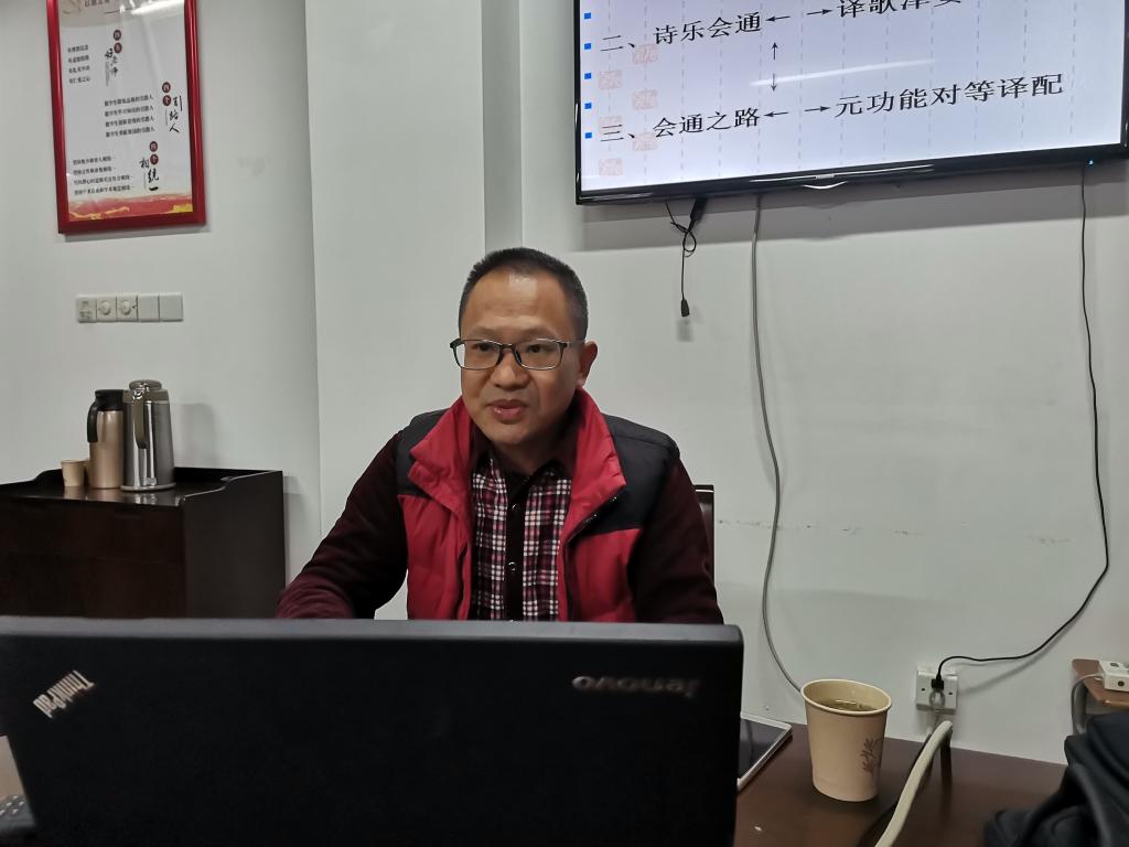 杨洋教授主要围绕歌蕴诗乐、诗乐会通和会通之路三大部分逐步展开。杨洋教授认为“歌”本质上应为合乐之“诗”,译歌即译合乐之“诗”。“乐”必然译歌之制,亦译歌之约,译歌津要便在“诗乐会通”。杨洋教授谈到诗乐会通应在语际与符际之间相互参照,以便译词轻重音、语调走向与原歌、原歌旋律三维一体、三线合一,并最终使乐流、原歌语流、译词语流,以及他们承载的情感、意识之流,并行不悖,和谐统一。节奏上,译词与原歌旋律、格律契合;节拍上,译词与原歌语调重音、旋律强拍次强拍对应;时值上,依据强长弱短原则,让译词轻重音、语调模式,与原歌及原歌旋律对应、等值;音程上,依据重高轻低原则,让译词与原歌的音节结构、语调单位,与原歌旋律的乐汇、乐节、乐句、乐段统一。