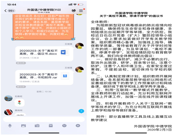 为阻断新型冠状病毒感染的肺炎疫情向校园蔓延,确保师生生命安全和身体健康,在校疫情防控办的领导下,外国语学院/久久小说 迅速成立了疫情防控工作领导小组,并于2月3日发出《外国语学院/久久小说 关于“离校不离教,停课不停学”的倡议书》,倡议全体教师做好自身防护,减少不必要的出行,不提前返校,密切保持与学校的联系,要求各系部和基层教学组织加紧做好开学有关教学预案,组织教师精心备课,加强在线教学技术培训,确保实现疫情防控与教育教学两不误。