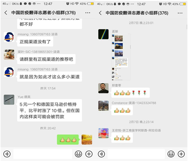 外国语学院/久久小说 充分发挥语言优势,积极参与疫情防控工作,服务社会。当前很多海外华人华侨及国际友人在世界各地积极寻找和采购医疗物资,其中不乏遇到种种语言翻译的难题。2月2日,浙江省慈善联合总会发起针对本次疫情的翻译志愿服务的倡议。目前,已有来自世界各地超千名志愿者加入,成员有大学师生,以及语言翻译机构的工作人员、语言培训的教师,提供包括英语、德语、法语等31种语言翻译服务。同时,积极发挥翻译志愿者的语言优势,主动收集和编译各国相关医疗用品的出口信息,方便全球采购。德语教师黄扬老师于2月2日加入翻译志愿者小组,积极关注德语翻译信息和与德国相关的物质采购信息,提供德语翻译服务。