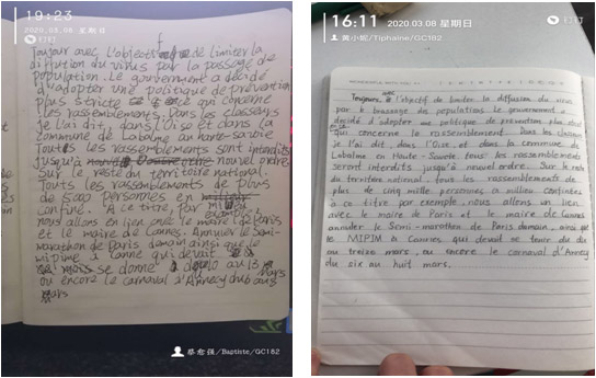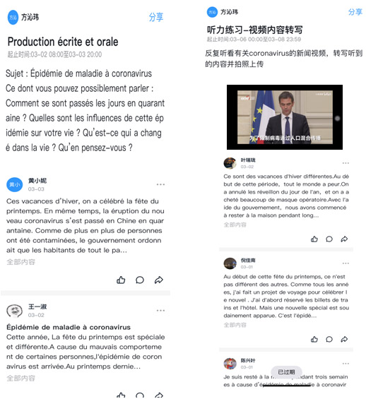 测试环节旨在引导学生课下的自主学习,巩固并训练已学知识和能力,包括系列习题小测、口笔语表达作业等形式。现阶段口笔语作业优先采用真实语料,结合抗击新冠肺炎疫情的时事,激发学生进一步的学习热情和兴趣。