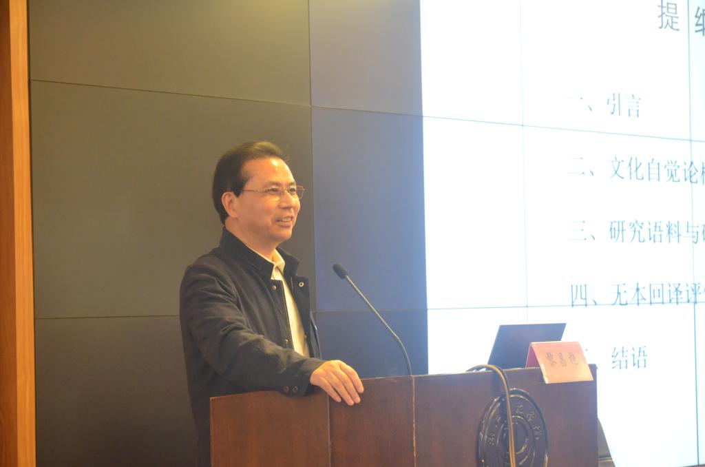 短暂而轻松的茶歇过后,黎昌抱教授的报告《中国题材异语作品无本回译评价标准研究》带来了极大启发和思考。回译研究是翻译学研究领域的热门话题,但是作为特殊回译现象的“无本回译”却鲜为人知。黎教授借助“文学自觉”这一概念提出了无本回译的重要性,通过文化认同、文化协调、文化创新和文化反省,正确处理本位文化与客观文化之间的关系,理解和接纳多元文化,从而共同构建新的文化语境。基于自建的研究语料和研究方法,黎教授总结了无本回译可遵循的四条评价标准:一是文化内容是否朝着跨文化写作者设想中的“原本”方向努力还原;二是译作语言是否最大限度地向本位文化语境归化;三是作品的文本类型是否得到有效保留;四是译作是否符合读者的本位文化现实性。