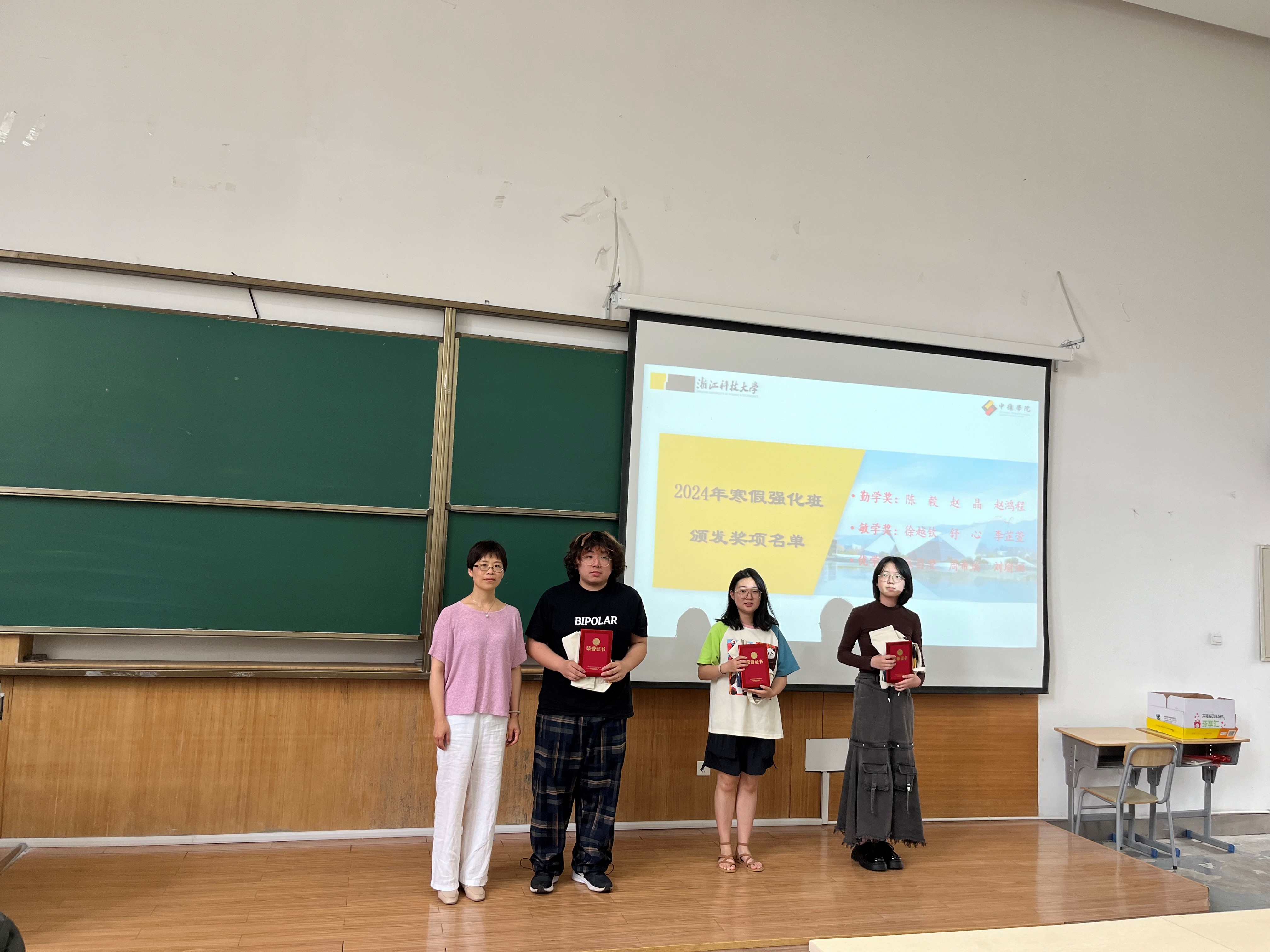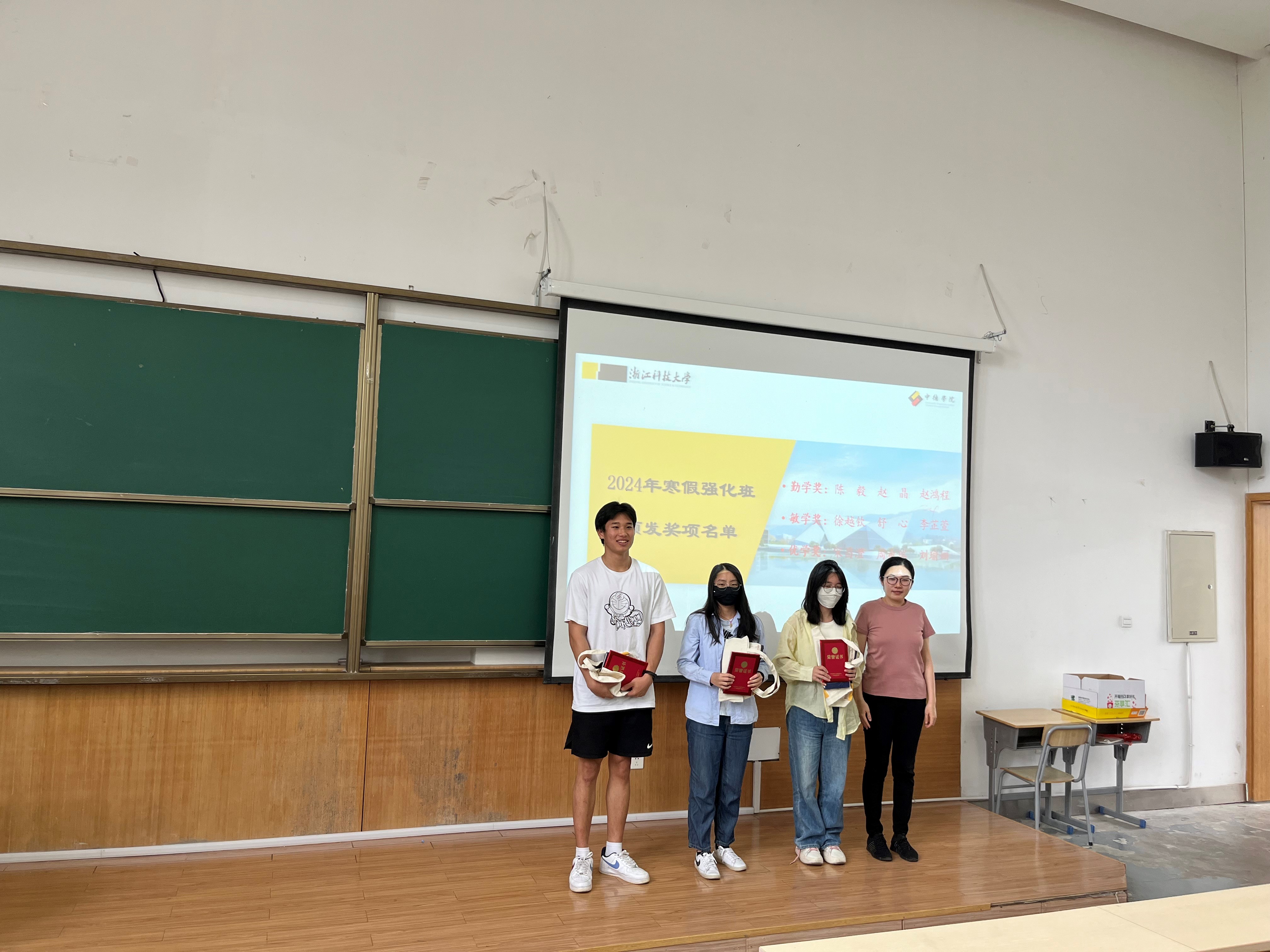 久久小说 培训部黄骅老师主持颁奖仪式。德语教学部副主任褚静老师,以及一年级组俞丹老师和朱冠文老师,分别向获得勤学奖、敏学奖和优学奖的九位同学颁发了奖状和奖品并合影留念。