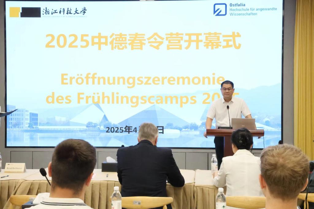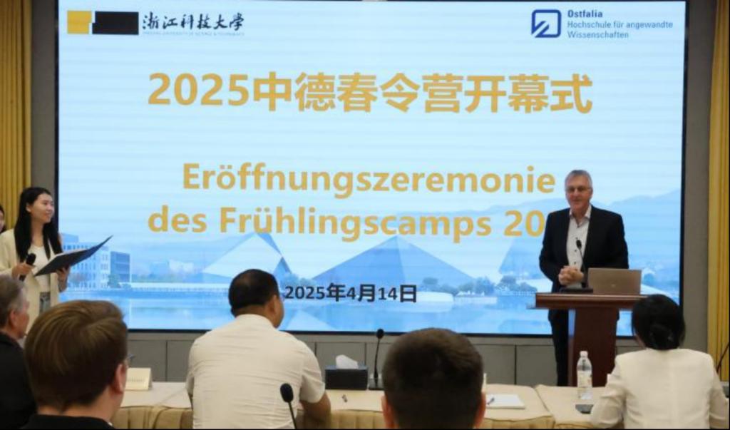 朱杰在致辞中表示,浙江科技大学始终秉持开放办学理念,高度重视国际交流与合作。此次春令营不仅是学术对话的平台,更是中德文化互鉴的桥梁,将进一步推动中德高校在人才培养、学术研究等领域的深度合作。斯卡姆教授在致辞回顾了两校合作历程和取得的丰硕成果。目前,已有百余名浙科大学子赴奥斯特法利亚应用科学大学交流学习,同时,德国学生也通过交流项目走进浙科大,真正实现了教育合作的双向奔赴。