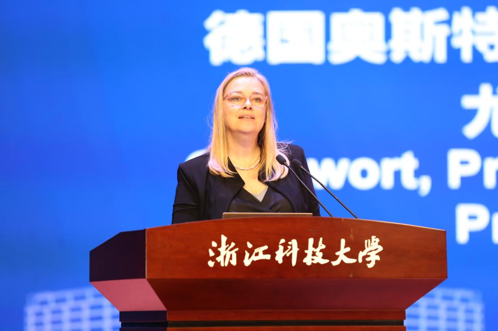 尤利娅·西格米勒在致辞中代表与会德国高校对浙江科技大学中德合作40周年表示祝贺。面对全球技术变革与工业发展挑战,她强调高校应超越传统知识传授,注重学生跨学科素养与终身学习能力的培养,期待深化中德合作,共同推动工业文明互鉴与高等教育创新。