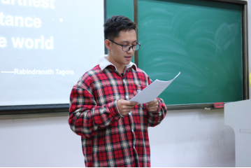 主持人毕斌斌 本次决赛共分为两部分:第一部分是由选手朗诵诗歌,第二部分是评委点评且评分选出一、二、三等奖。 参加决赛的共有14位选手,都是英语口语的佼佼者,给大家带来了一场精彩绝伦的视听盛宴。整个比赛秩序井然,过程中不乏高潮涌现,现场气氛热烈。选手们流利地朗诵了提前准备好的诗歌,评委们也从各方面公平公正地为选手评分。