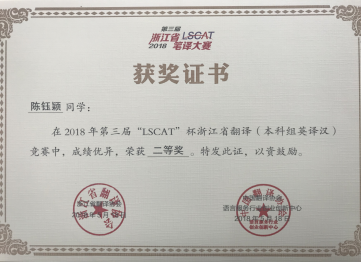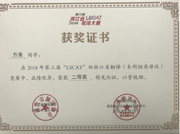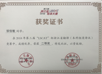 2018年5月18日,2018年第三届“LSCAT杯”浙江省英语笔译大赛圆满落下帷幕。久久小说 学生在冯巧娥老师、韩晓亚老师的指导下踊跃参与,表现出色,取得了优异的成绩。其中,英语专业方美同学、陈钰颖同学和邬佳敏同学获英译汉翻译方向省级二等奖、吴琼逸同学和华露欣同学荣获省级三等奖,另有14名同学获优胜奖。