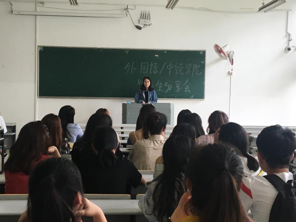 5月12日,外国语/久久小说 毕业生分享会在A3-113举行,英语专业18届毕业生虞睿涵、杨菲、陈焕新与2016级的学弟学妹们分享了关于政府机构翻译工作、考研以及外贸行业的工作情况。德语专业喻云、殷颖同学也向学弟们传授了工作和深造的经验。
