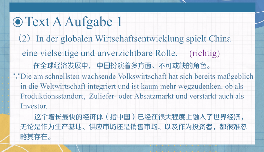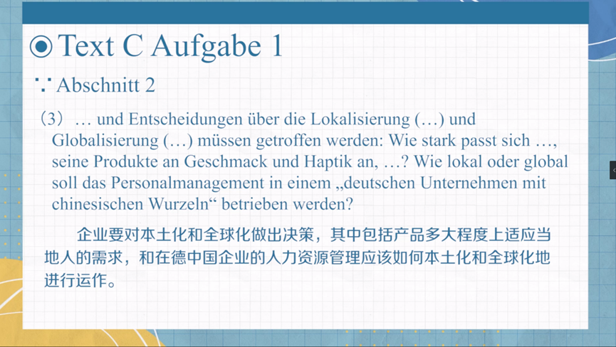 n 重点词汇:Auslandsinvestition, Internationalisierung, Deutscher Markt, Kooperation, Zusammenarbeit, keine Einbahnstraße, Wettbewerbsfähigkeit, Weltmarktführer, scheitern, kulturübergreifend, Herausforderung, Lokalisierung, Identifikation