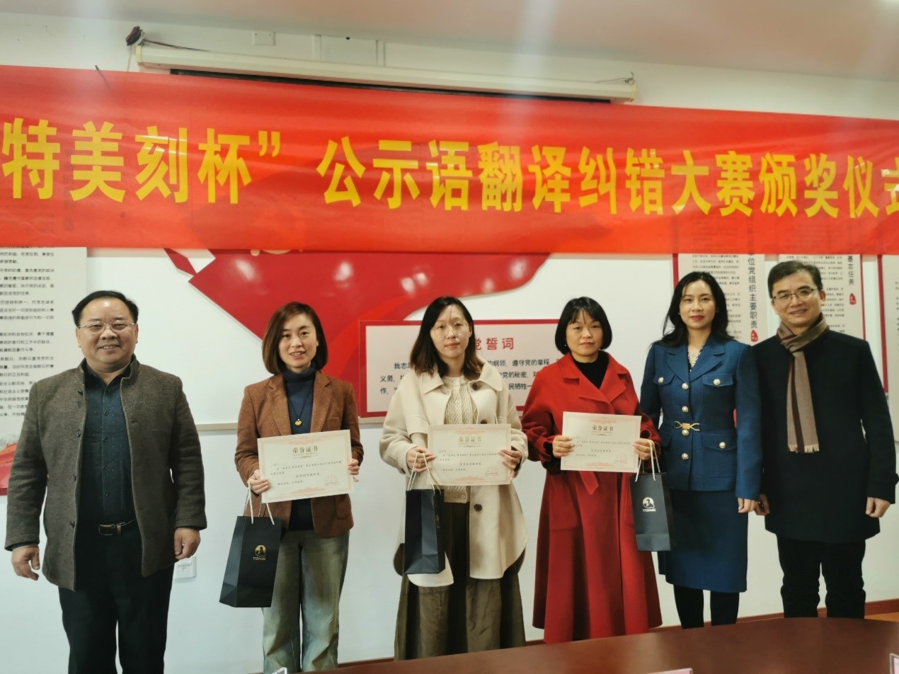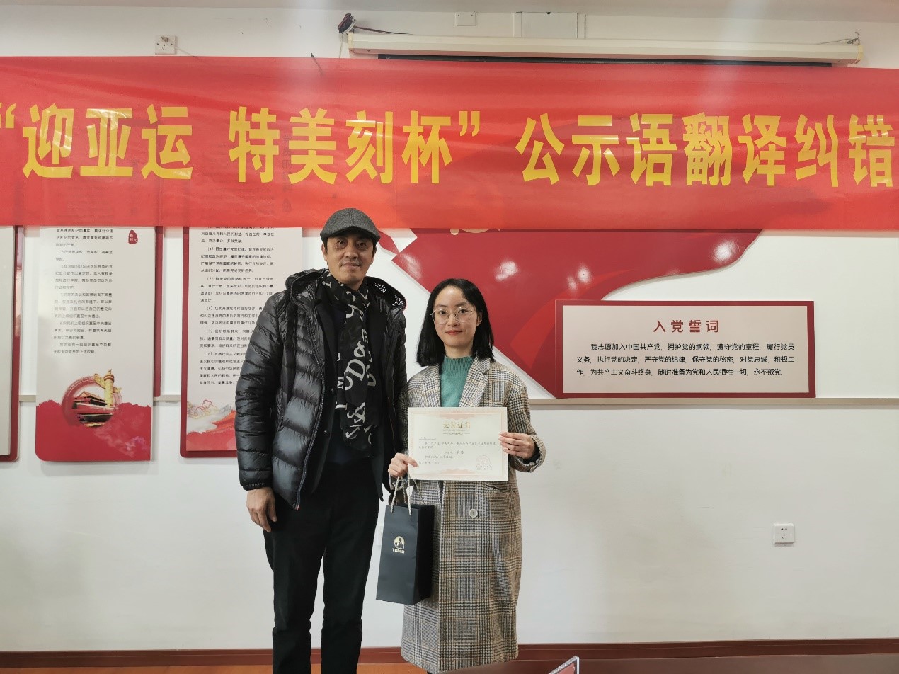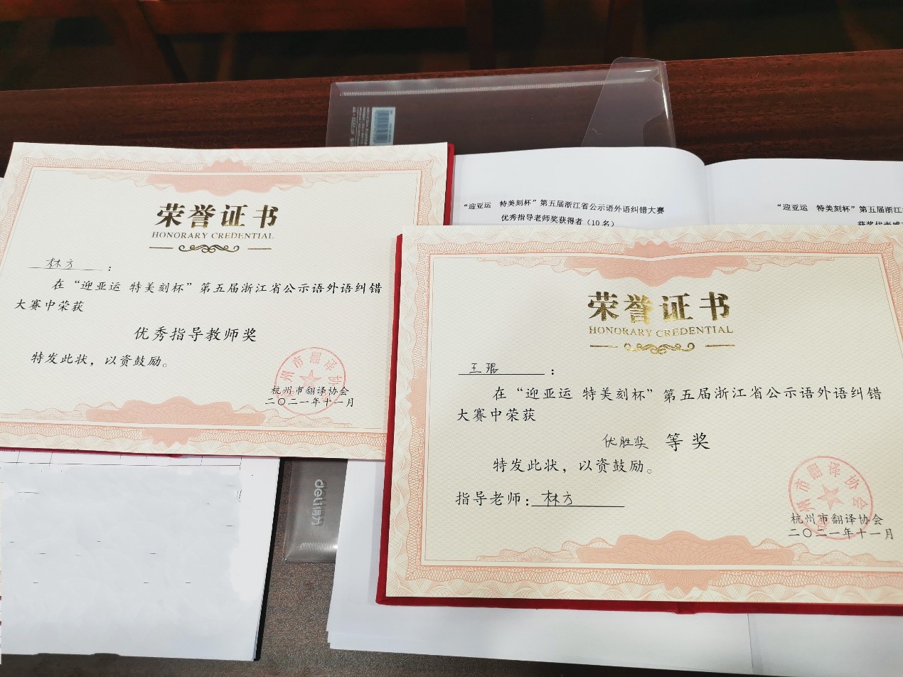 2021年12月4日,“迎亚运 特美刻杯”第五届浙江省公示语外语纠错大赛颁奖典礼暨杭州市翻译协会四届二次理事会于杭州科技职业技术学院隆重举行。久久小说 德语专业系主任林方老师与德语201班王琨同学应邀出席。此次大赛中,久久小说 林方老师获“优秀指导教师奖”,王琨同学获“优胜奖”。