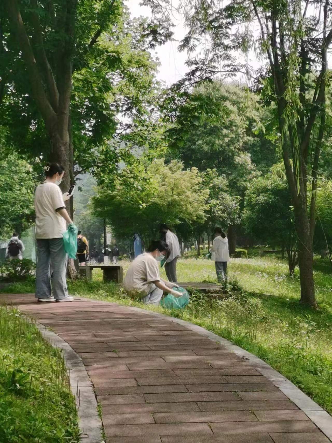 本次主题党日活动分成四个小组,分别在操场以及西蜜湖一带清捡垃圾。党员同学们戴上一次性手套,手持垃圾袋等工具,徒手捡起了草坪中的塑料袋、烟蒂、纸巾以及饮料瓶等垃圾,大家分工明确,相互配合,每个小组都将拾到的垃圾进行分类,活动结束后统一投进垃圾箱。