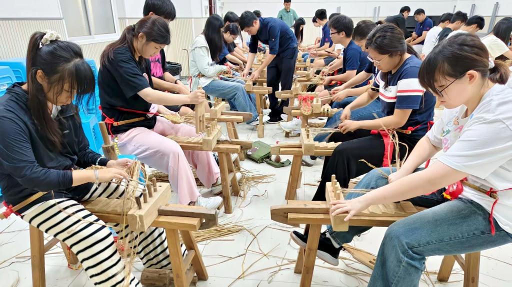 当地的老手艺人手把手教我们理稻草、搓草绳、纳鞋底、编鞋帮。“绳要紧,结要实,就像红军守信念,不能松!”师傅声音洪亮,一双粗粝的手在金色的稻草间来回穿梭。横拉竖引,每一下都扎实利落,指节间藏着一代代传下来的技艺密码。那不只是编织鞋履,更是在指尖重启一段岁月——粗糙的稻草渐渐有了温度,革命先辈的智慧与信念,也仿佛顺着这细细的“经纬”,流入我们的掌心。