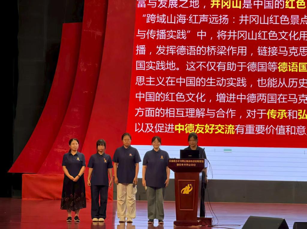 随后,团队5人在井冈山中心圆满完成初步成果汇报。同学们以一系列扎实的课题成果向这片革命圣地致敬,包括德语术语表、德语讲解词、井冈山故事译介等内容。“这是起点,不是终点”——团队始终坚信,红色故事的国际传播不仅是语言的转化,更是一场精神的对话。大家期待通过持续努力,让井冈山的星火跨越山海,在德语世界绽放出新的时代光芒。