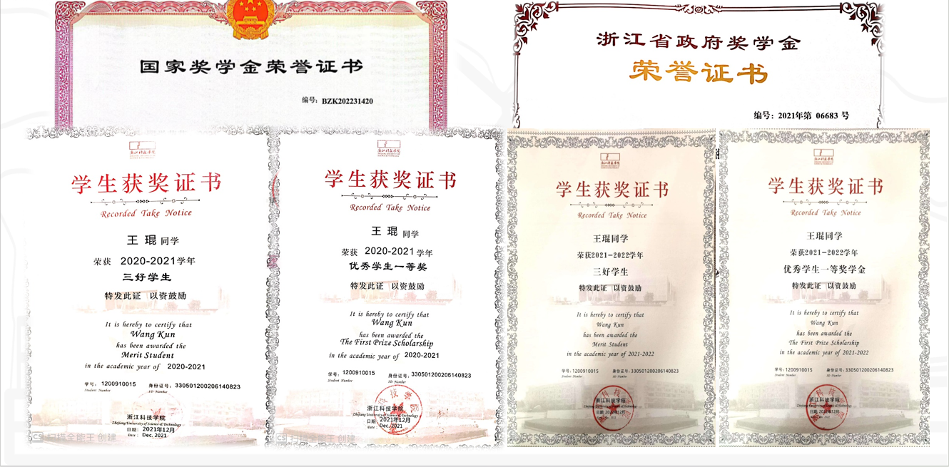 课堂上,认真聆听每一位老师的讲解,对每一个发音、每一个语法点都力求精准掌握,大学四年平均学分绩点专业第一,通过德语专业八级考试,多次获得各类奖学金;积极参加学科竞赛,获奖共计30余项(包括A类7项、B类1项、C类6项),获评“浙江省优秀毕业生”。